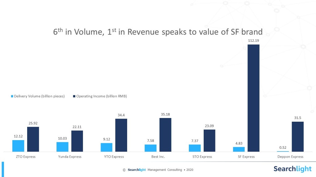 SF has built a reputation with consumers by focusing on the most premium end of the market – express / overnight deliveries. The other delivery companies have tended to create more options for the consumer on slower, less expensive services, giving them a lot of volume but not the kind of pricing and margin that SF has achieved.